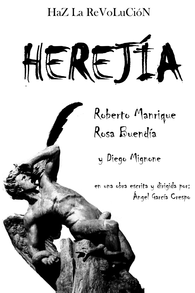 Roberto Manrique: "Herejía" es para mí la oportunidad de arrancar en un mercado que tengo en la mira desde hace algún tiempo y surgió de manera espontánea mientras estudiaba aquí en Madrid, y cuando las cosas fluyen de esa manera son, para mí, algo especial. Es además una obra original de Ángel García Crespo que se representa por primera vez, por lo tanto un estreno absoluto (de momento, del 20 al 22 de abril, en la sala "Garaje Lumiére", en Madrid), de una intensidad física y emocional tal, que me representan un reto y la oportunidad de explorar nuevas dimensiones en escena. Es también la primera vez que me desnudaré por completo para un personaje. Me gusta llevarme al límite e ir descubriendo más y más de lo que soy capaz y de lo que no, y este personaje proyecto me aporta mucho en esa exploración. La obra es la historia de un secuestrado que desconoce el motivo por el que está ahí y es torturado, que junto con el público lo irá descubriendo durante la obra, para finalmente ser transformado hacia una nueva visión.