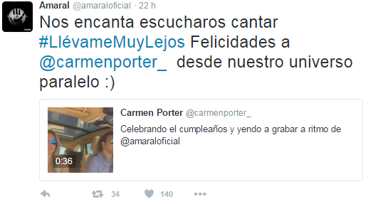 Celebrando el cumpleaños y yendo a grabar a ritmo de @amaraloficial pic.twitter.com/tEaOOTGUgW— Carmen Porter (@carmenporter_) 23 de agosto de 2016