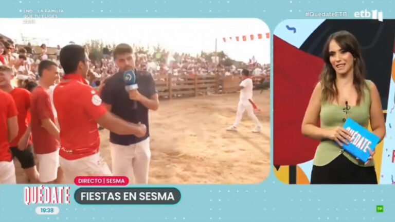 Gran susto el que se ha vivido este martes, 26 de agosto, en programa 'Quédate', de la televisión pública vasca Euskal Telebista (ETB2). Los espectadores del espacio, y la propia presentadora, vivieron un momento de mucha angustia cuando uno de sus reporteros fue embestido por una vaquilla en plena conexión en directo.