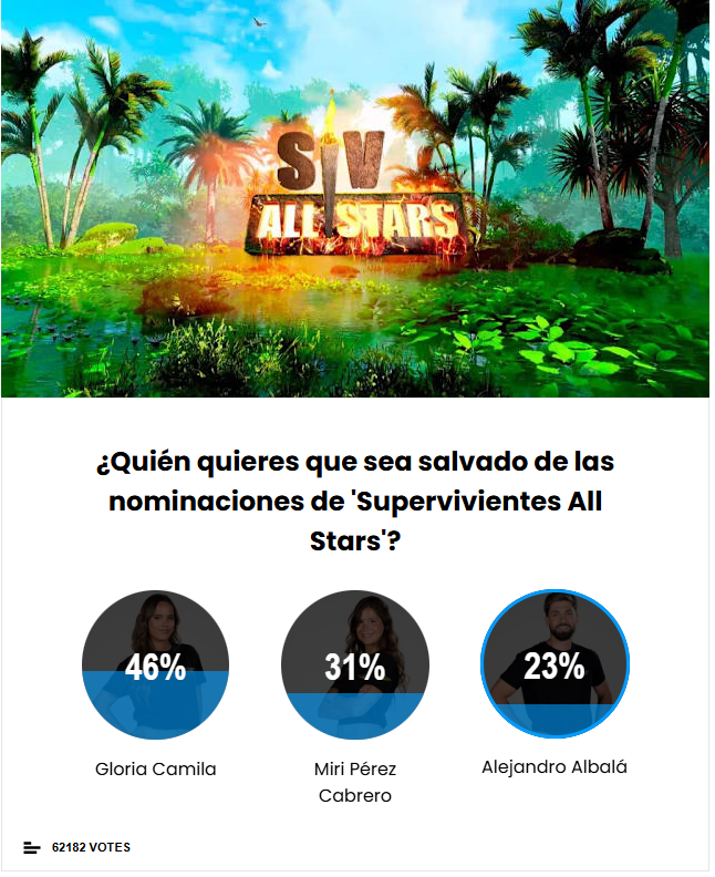 Hasta que se produzca la ceremonia de eliminación en la quinta gala que ofrece Telecinco a partir de las 22:00 horas, puedes seguir votando en la app de Mediaset Infinity y también participando en la encuesta de El Televisero. Y tú, ¿quién quieres que sea el salvado de 'Supervivientes': Gloria Camila, Miri o Alejandro Albalá? ¡VOTA YA!