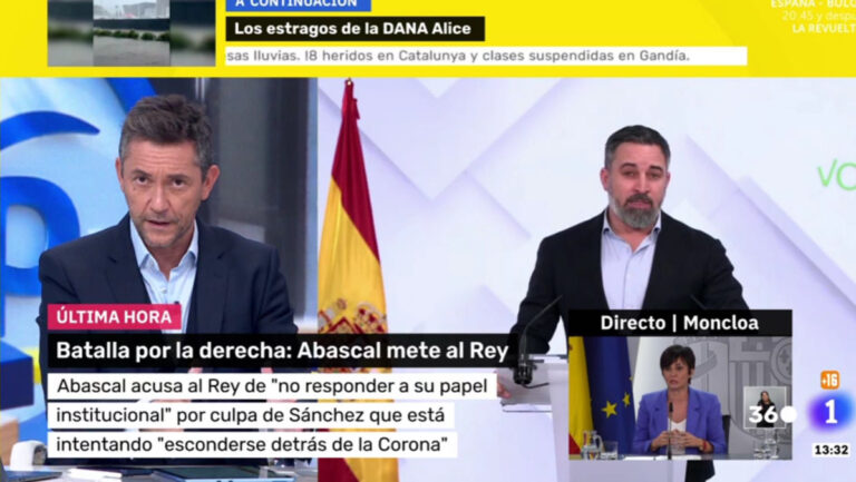 "Atentos a dónde está escorando su posición Vox. Hoy, ha llamado 'Felpudo VI' al Rey por firmar la ley de amnistía. Algo que el Rey no tiene más que esa opción de hacer. Pues hoy, Santiago Abascal dice que Felipe VI es un títere de Sánchez", ha introducido el comunicador de TVE.