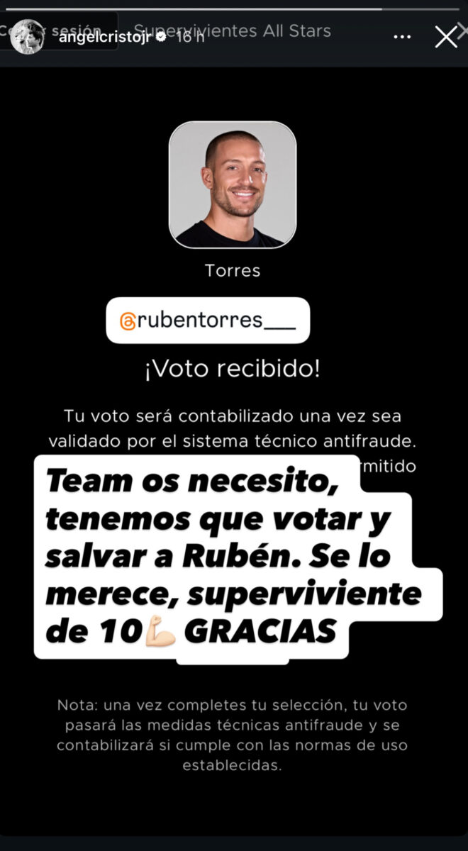 "Team, os necesito. Tenemos que votar y salvar a Rubén. Se lo merece. Es un superviviente de 10", ha escrito Ángel Cristo en las últimas horas sobre una captura de su voto a Rubén Torres en la plataforma de Mediaset Infinity en la que todos los usuarios pueden participar.