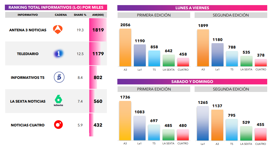 Antena 3 Noticias (19,3% y +1,8 M) son los informativos más vistos, líderes