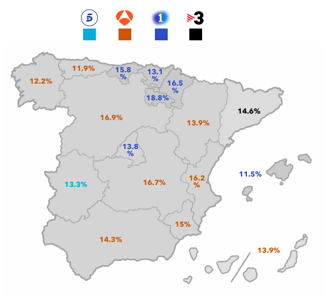 Por CCAA: Antena 3 se impone en 9 de las 17 Comunidades Autónomas