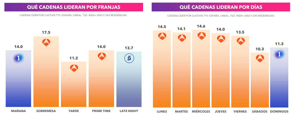 Antena 3 es la cadena más vista en las dos franjas de mayor consumo del día: la sobremesa con el 17.5% de share y el prime time con el 14% de cuota. Mantiene su liderazgo en la franja de tarde (11.2%), mejorando seis décimas respecto a septiembre del año pasado. Además, se impone a sus competidores todos los días de la semana, de lunes a sábado. La1 lidera la franja de mañana (14%) y Telecinco domina el late night (13.7%).