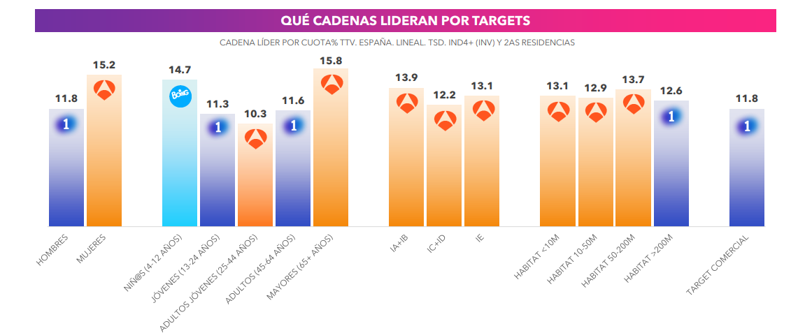 Antena 3 es la cadena líder entre las mujeres (15.2% de share) y, también, tanto en espectadores de 25 a 44 años (10.3%) como en los mayores de 65 años (15.8%). Antena 3 es la cadena más vista en septiembre en todas las clases sociales. Por su lado, La1 es la opción más vista entre los hombres (11.8%), en adultos de 45 a 64 años (11.6%) y target comercial (11,8%).