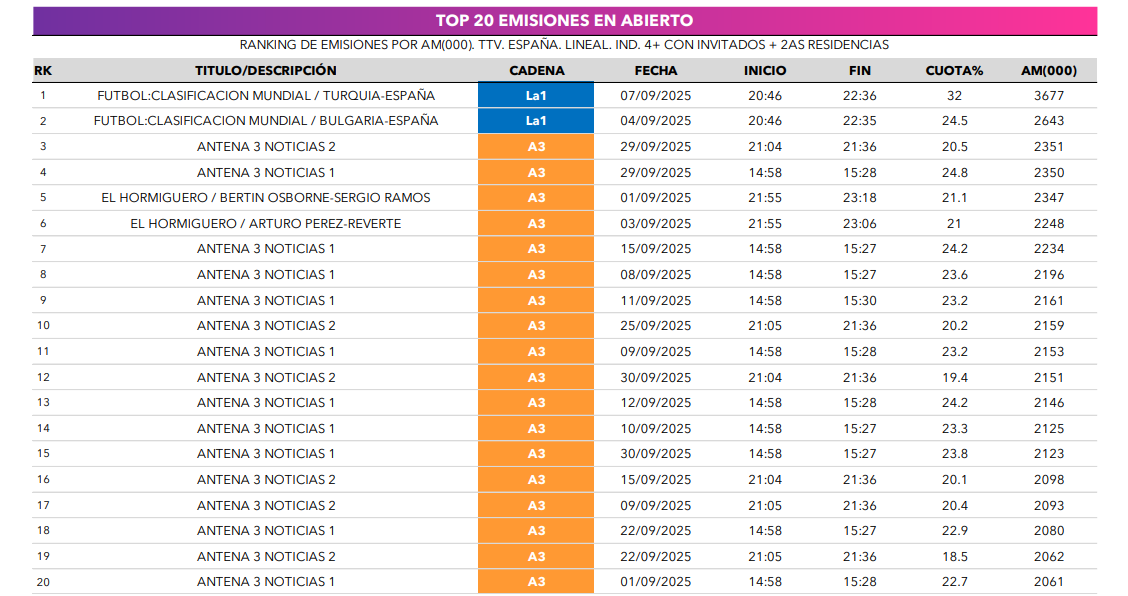 Antena 3 (13%) logra una gran subida en el arranque de temporada de +0,8 puntos hasta su mejor septiembre desde 2023. Amplía su racha de liderazgo a 14 meses consecutivos y sigue inalcanzable de la Sobremesa al Prime Time.