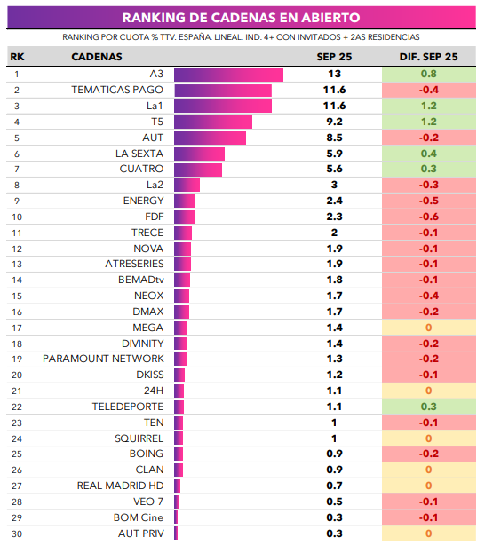 Energy (2.4%) lidera el ranking de los canales temáticos, seguidos de FDF (2,3%) y Trece (2%). Nova es la cadena más vista de Atresmedia con un 1.9%). Bajada generalizada de los canales temáticos con el arranque de la nueva temporada.