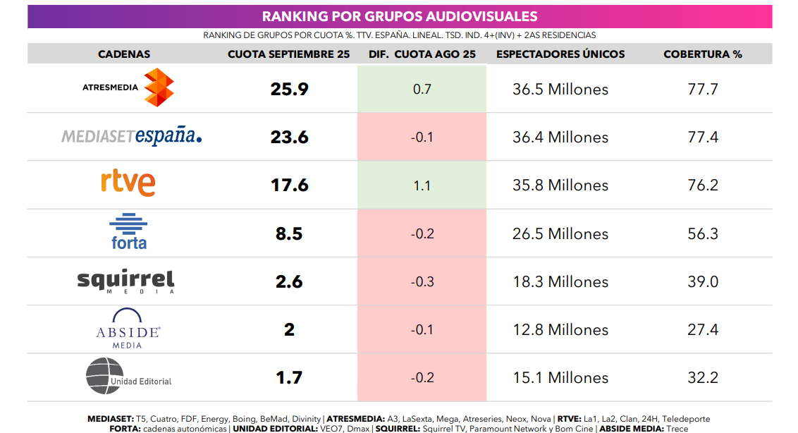 Por grupos, Atresmedia lidera por 30º mes consecutivo con un 25,9%. Le sigue Mediaset España con un 23,6%. Por su lado, el grupo RTVE registra un promedio del 17,6% en septiembre.