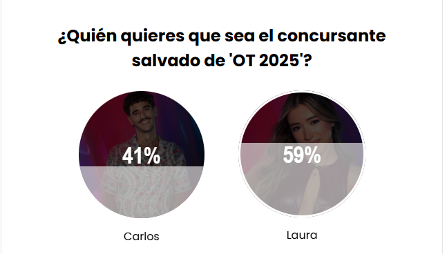 Así, según los lectores de nuestra web que han votado durante toda esta semana, el tercer expulsado de 'OT 2025' será Carlos de los Reyes pues solo el 41% de los usuarios han votado para que sea él quien siga en la academia. Mientras que un 59% de los votos considera que debe ser Laura Muñoz la que debe mantenerse en el talent show presentado por Chenoa.