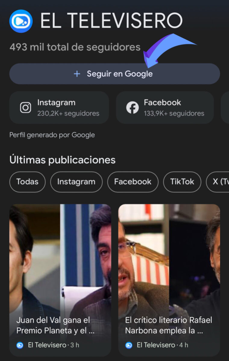 Configurar Google Discover para seguir a El Televisero es un proceso muy sencillo. Primero, asegúrate de que has iniciado sesión con tu usuario de Google. Una vez confirmada esta parte, entra en la página de perfil de El Televisero. Haz clic en el botón alargado de "Seguir en Google". Con este sencillísimo gesto, Google te irá mostrando en tu página personal de Discover más noticias, exclusivas, entrevistas... de El Televisero.