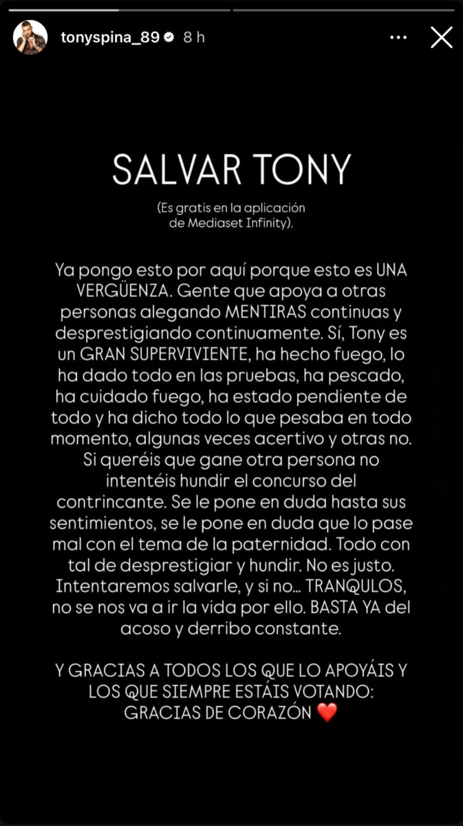 "Se le pone en duda hasta sus sentimientos, se le pone en duda que lo pase mal con el tema de la paternidad. Todo con tal de desprestigiar y hundir. No es justo", subraya el comunicado. En paralelo, ante la nominación de Tony Spina junto a Rubén Torres y Jessica Bueno que le coloca en riesgo de expulsión en el primer televoto de la final, remata: "Intentaremos salvarle, y si no… TRANQULOS, no se nos va a ir la vida por ello. BASTA YA del acoso y derribo constante. Y GRACIAS A TODOS LOS QUE LO APOYÁIS Y LOS QUE SIEMPRE ESTÁIS VOTANDO: GRACIAS DE CORAZÓN".
