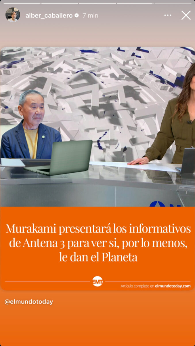 Se trata de un post publicado por el periódico satírico 'Mundo Today' que dice lo siguiente: "Murakami (escritor japonés) presentará los informativos de Antena 3 para ver si, por lo menos, le dan el Planeta".