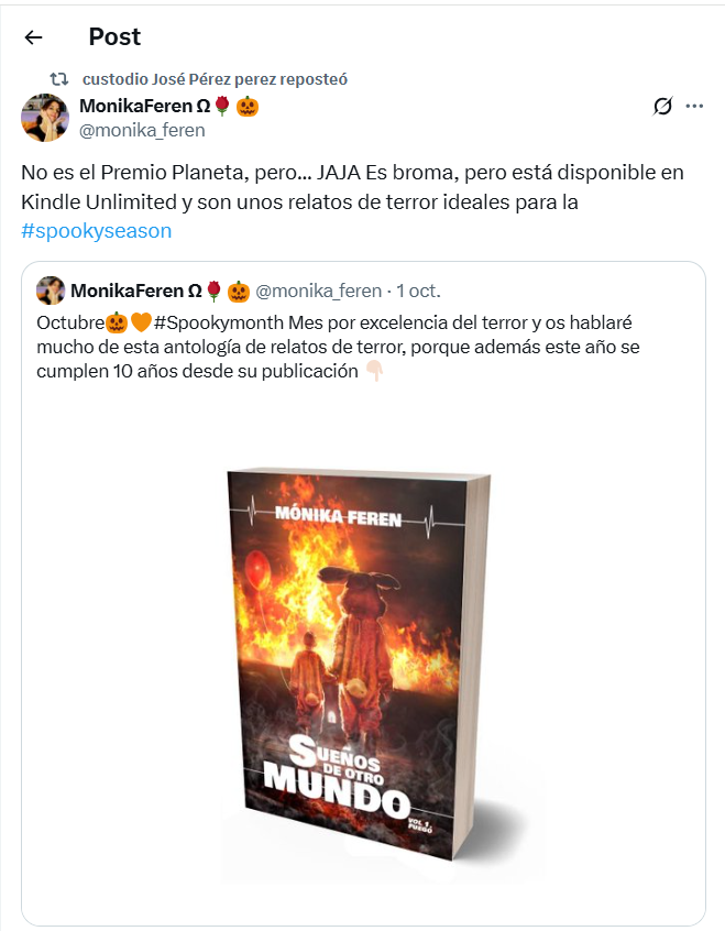 Por si fuera poco, en su cuenta de "X", Custodio Pérez no ha dudado en compartir un mensaje que deja mal parado a Juan del Val. "No es el Premio Planeta, pero... JAJA Es broma, pero está disponible en Kindle Unlimited y son unos relatos de terror ideales para la #spookyseason", rezaba el mensaje que ha retuiteado.