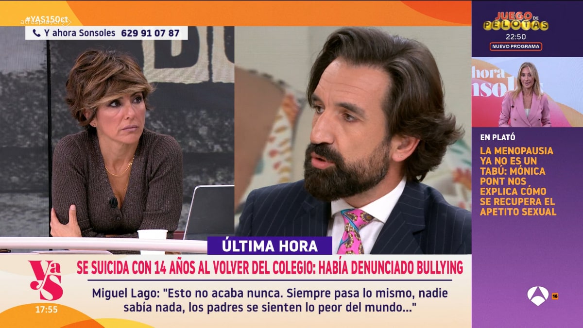 Sonsoles Ónega se ha hecho eco este miércoles de una de esas noticias que rompen a cualquiera. La presentadora de 'Y ahora Sonsoles' informaba del caso de una joven de 14 años que se ha suicidado después de haber denunciado que sufría bullying. Un tema que provocaba que Miguel Lago se resquebrajara y mostrara su indignación.