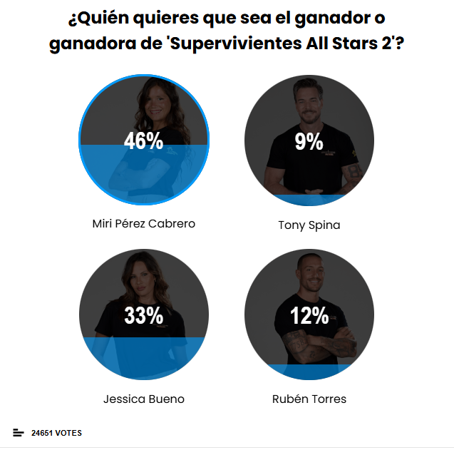 Con casi 25.000 votos parece que hay un claro favorito por los lectores de El Televisero para ganar 'Supervivientes All Stars'. Así, para el 46% de los usuarios debe ser Miri Pérez-Cabrero la que se lleve la victoria y los 50.000 euros de premio. La segunda finalista según nuestra encuesta será Jessica Bueno según el 33%. Después en esta encuesta se sitúa Rubén Torres con un 12% seguido de cerca por Tony Spina con un 9%.