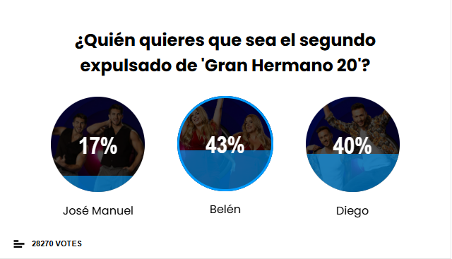 Así, para el 43% de los usuarios la expulsada tiene que ser Belén. Muy de cerca le sigue Diego, que debe ser el que abandone la casa de 'Gran Hermano 20' según el 40% de los lectores que han votado en la encuesta. Por último, el que se librará parece de la expulsión será José Manuel pues solo un 17% considera que debe ser él quién deje la casa.