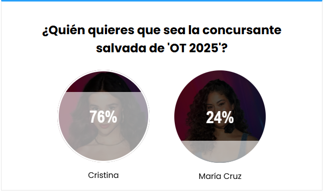Así, según el 76% de los lectores consideran que Cristina debe permanecer una semana más en la academia de 'OT 2025' mientras que María Cruz será la séptima expulsada de esta edición al solo contar con el 24% de los votos.