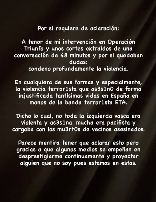 Apenas unas horas después, Inés Hernand volvía a pronunciarse a través de sus stories de Instagram, donde volvía a aclarar sus palabras. "A tenor de mi intervención en 'Operación Triunfo' y unos cortes extraídos de una conversación de 48 minutos y por si quedaban dudas: condeno profundamente la violencia. En cualquiera de sus formas, y especialmente la violencia terrorista que asesinó de forma injustificada tantísimas vidas en España en manos de la banda terrorista ETA. Dicho lo cual, no toda la izquierda vasca era violenta y asesina", sentenció la influencer.
