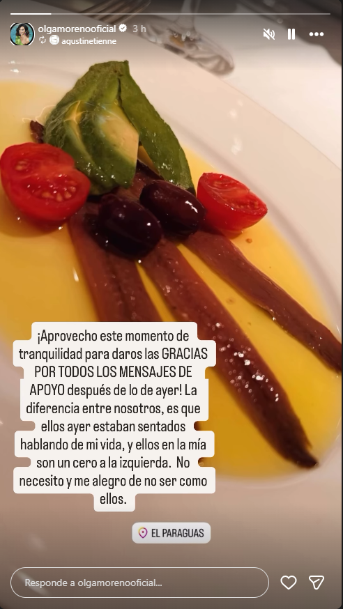 Pues bien, este viernes, Olga Moreno ha querido poner fin a todos los rumores sobre una posible ruptura o crisis con Agustín Ettiene compartiendo un story del propio representante en el que se veía cómo ambos estaban comiendo en un restaurante.