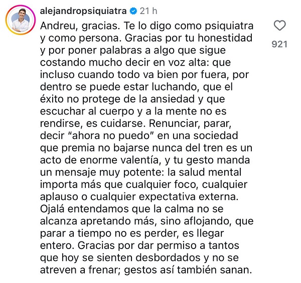 Alejandro Martínez Rico no solo dedicó un post de Instagram a hablar de la importancia del mensaje del presentador de 'Futuro Imperfecto’' sino que también le dedicó unas palabras de apoyo y cariño en la publicación del propio Buenafuente en Instagram. "Andreu, gracias. Te lo digo como psiquiatra y como persona", comienza escribiendo el doctor en la sección de comentarios.