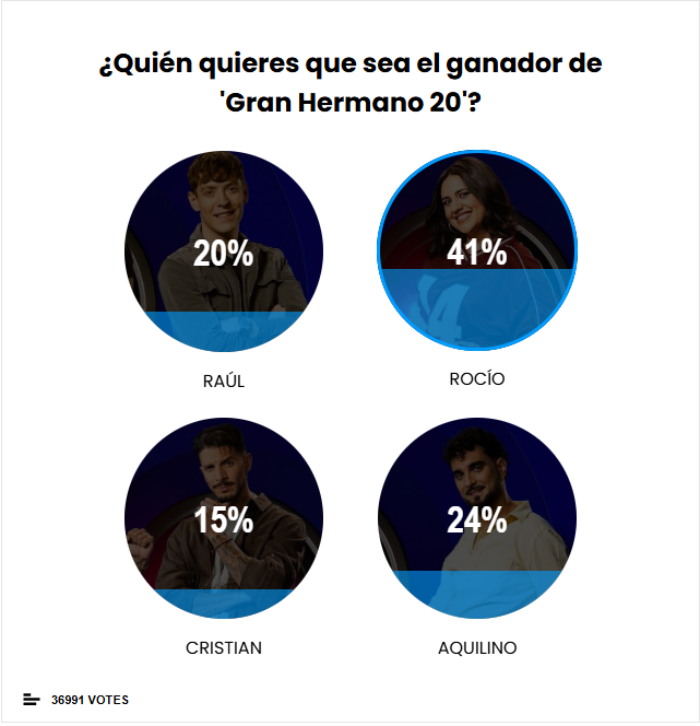Según los usuarios de la encuesta de El Televisero la ganadora de 'Gran hermano 20' será Rocío pues obtiene el 41% de los votos. El segundo finalista será Aquilino según nuestros lectores pues cuenta con el 24% de los apoyos. Mientras Raúl se quedaría tercer finalista con un 20% y finalmente, Cristian será el cuarto finalista con un 15% de los votos.