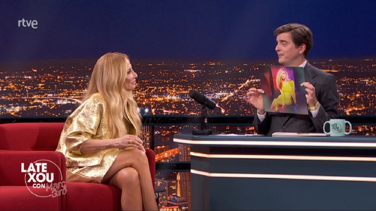 El presentador le daba una calurosa bienvenida. Algo que ella agradeció piropeándole: "Por fin te conozco. Me caes genial, te adoro". Ya entrados en materia, el catalán ha mostrado alguna de las fotos que aparecen el disco, así como un texto sobre ella, del que dijo: "Lectura obligatoria si eres sanchista". En ese instante, se daba cuenta de lo que acababa de decir, y es que para ciertos sectores, tanto él como TVE son 'sanchistas' por su supuesta defensa de Pedro Sánchez.