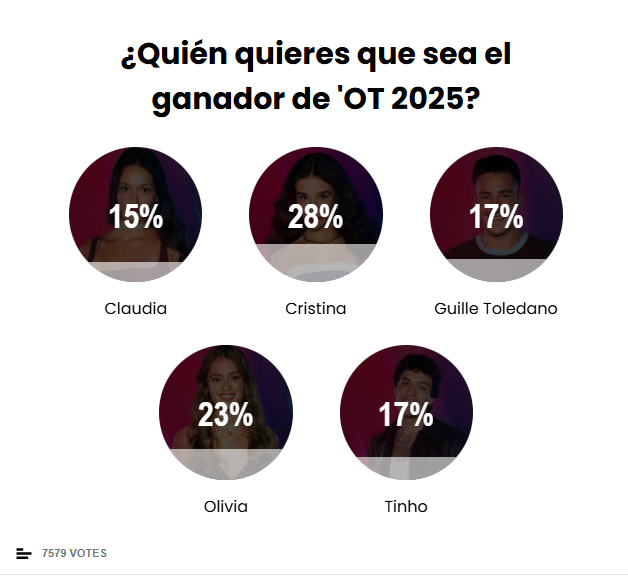 Según los usuarios de la encuesta de El Televisero la ganadora de 'OT 2025' será Cristina pues obtiene el 28% de los votos. Por detrás se quedará Olivia como segunda finalista con un 23% de los votos. Mientras que la tercera plaza estará muy disputada entre Guille Toledano y Tinho pues ambos tienen un 17% de apoyo. Finalmente, la quinta finalista será Claudia Arenas según el 15% de los votos.