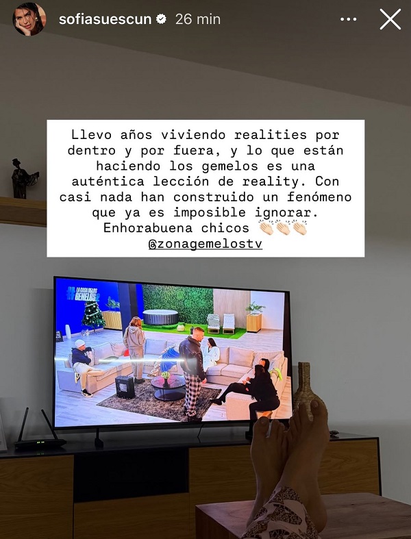 La influencer compartía un storie en su perfil de Instagram mostrando públicamente su apoyo a 'La casa de los gemelos 2'. Un mensaje que muchos han interpretado como una indirecta a la cadena que le vio nacer. "Llevo años viviendo realities por dentro y por fuera, y lo que están haciendo los gemelos es una auténtica lección de reality. Con casi nada han construido un fenómeno que ya es imposible ignorar. Enhorabuena, chicos", escribió Sofía Suescun.