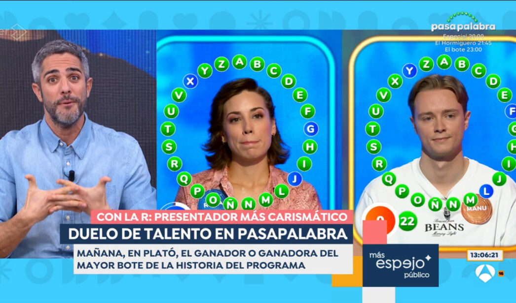 Roberto Leal ha acudido al plató de 'Espejo Público' para promocionar la entrega del bote de 'Pasapalabra' más alto de la historia de este jueves. Todo un acontecimiento televisivo que Antena 3 ha decidido trasladar -como es habitual- al prime time. Será a partir de las 23:00 horas cuando se conozca la identidad del ganador de una suma de dinero jamás vista en el concurso: 2.716.000 euros. ¿Será Manu Pascual el que consume esa gesta o Rosa Rodríguez?