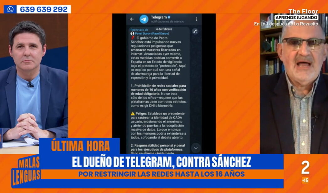 Después de que Elon Musk haya atacado a Pedro Sánchez tras el anuncio del Gobierno de que prohibirá el acceso a las redes sociales de los menores de 16 años, ahora ha sido el dueño de Telegram el que ha mandado a todos los usuarios un mensaje contra el presidente del Gobierno. Un aviso que le llegaba a Antón Losada en plena conexión con Jesús Cintora en 'Malas Lenguas'.