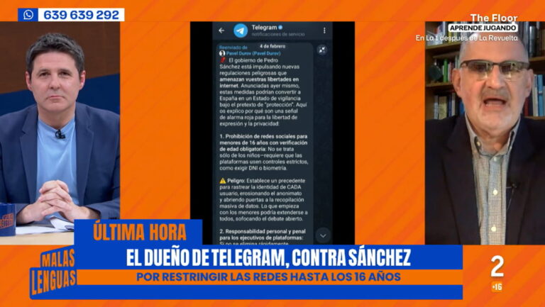 Así, cuando estaban en directo, Jesús Cintora conectaba con la redacción para conocer el mensaje que acababa de mandar Telegram a muchos de sus usuarios. "El Gobierno de de Pedro Sánchez está impulsando nuevas regulaciones peligrosas que amenazan vuestras libertades en internet. Anunciadas ayer mismo, estas medidas podrían convertir a España en un Estado de vigilancia bajo el pretexto de 'protección'", dice el mensaje enviado por Pavel Durov, el fundador de Telegram.