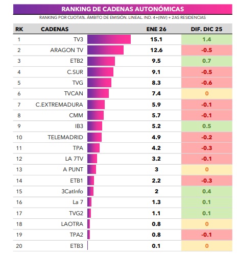 AUTONÓMICAS: TV3 es la cadena autonómica líder. Mejor enero histórico para Aragón TV