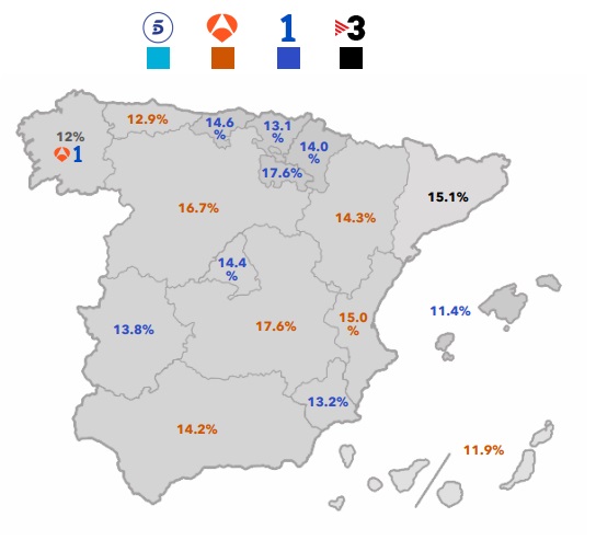 Así las cosas, Antena 3 vuelve a ser la cadena líder con un 12,9%, encadenando 18 meses de liderazgo ininterrumpido. Tiene en su haber, una vez más, los programas más vistos de la televisión. La 1 de TVE (12,2%) iguala su dato de diciembre y sigue anotando nuevos récords logrando su mejor enero de los últimos 14 años. Telecinco (8,5%) sube con respecto a diciembre una única décima, pero marca su enero menos visto desde su nacimiento.