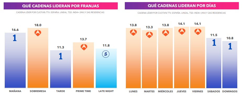 Antena 3 (12,9%) suma un año y medio de liderazgo