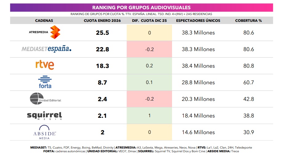 Por grupos, Atresmedia lidera por 33º mes consecutivo con un 25,5%. Le sigue Mediaset España con un 22,8%. Por su lado, el grupo RTVE registra un promedio del 18,3% en enero.