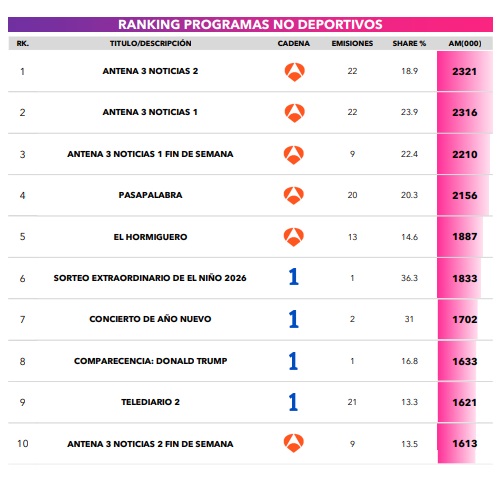 Antena 3 inaugura el año como terminó el anterior, siendo la TV líder durante 18 meses ininterrumpidos y superando los cuatro años a la cabeza. Con un 12,9% de cuota, mejora respecto a enero del pasado año y se sitúa de nuevo por delante de todos sus competidores, logrando la mayor ventaja en 30 años en un mes de enero sobre su competidor privado. Es líder de la sobremesa y el prime time, las franjas más importantes de la televisión.