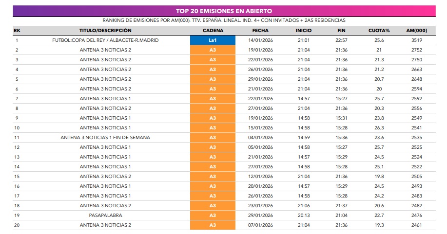 EMISIONES MÁS SEGUIDAS: Antena 3 Noticias copa 18 emisiones de las 20 más seguidas en enero
