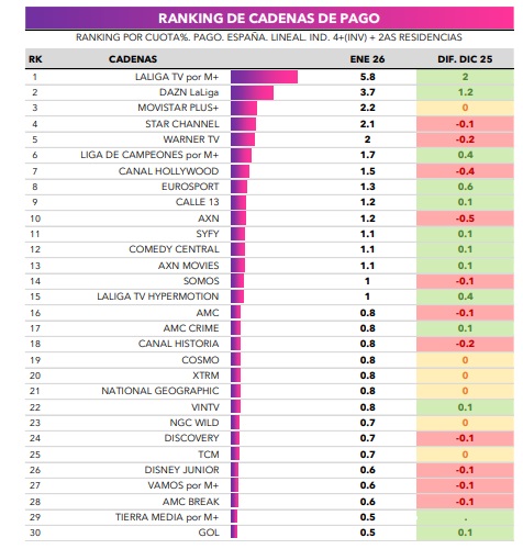 Entre las segundas cadenas, Cuatro (6,1%) vuelve a quedar por delante de La Sexta (6%), registrando su mejor mes de enero en 9 años. La diferencia, con tan solo una décima, es mínima.