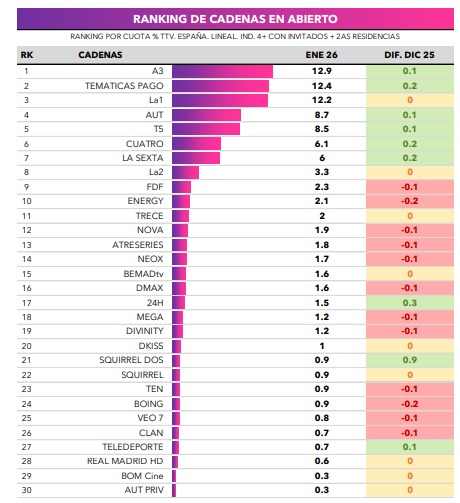 El año arranca dejando los mismos titulares como los que terminó 2025. La principal cadena de Atresmedia sigue ostentando el primer puesto tras haber ocupado durante la primera quincena del mes el segundo lugar gracias a los buenos datos cosechados por la cadena pública durante los primeros días de 2026. Finalmente, RTVE bajó a su habitual segundo puesto, síntoma de la enorme fuerza de Antena 3, capaz de arrebatarle el liderazgo en los últimos días de enero, y alejándose del sorpasso de La 1. Por contra, la que no se ha disputado nada ha sido Telecinco, cuya única competencia es sobre sí misma, evitando marcar un dato inferior al mes previo, o al mismo mes del año anterior. Una cosa la ha conseguido. La otra no.