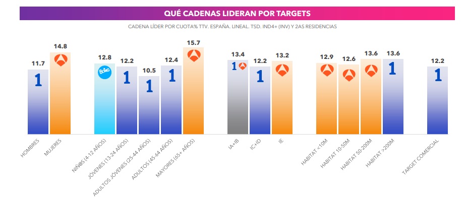 La1 es la cadena líder entre los hombres (11.7% de share) y en el grupo comprendido entre los 13 y los 64 años. Además, lidera en el Target Comercial con el 12.2% de cuota. Por su parte, Antena 3 es la opción líder en España en las mujeres (14.8%), en los mayores de 65 años (15.7%) y en los núcleos de población hasta 200.000 habitantes.