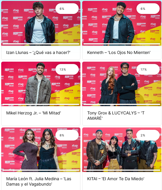 Después tanto Mayo como María León y Julia Medina obtienen un 8% mientras que Kenneth e Izan Llunas tienen el 6% de los apoyos. Por debajo se situarían The Quinquis con un 4%, Asha con un 3% y cerrando estarían Dani J y Kitai con un 2%.