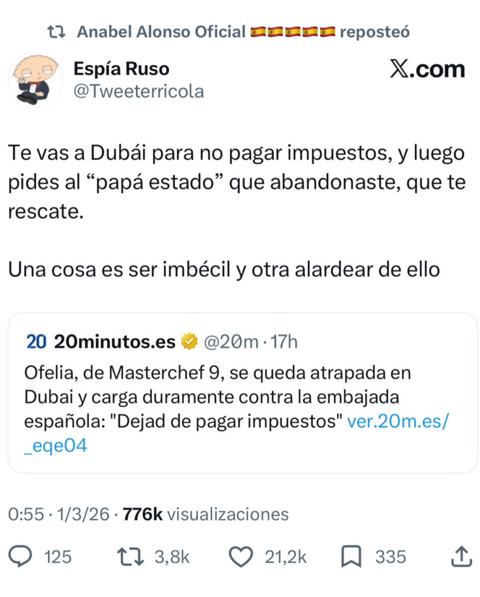 Inmediatamente, el vídeo se ha viralizado por las redes sociales. Y, aunque muchos usuarios han mostrado su apoyo a Ofelia y han intentado tranquilizarla, otros muchos han cargado contra ella por mudarse fuera de España para evadir impuestos y luego pedir la ayuda del Gobierno español. Entre los más críticos con la chef se encuentra Anabel Alonso, quien ha compartido un tuit muy duro contra la joven.