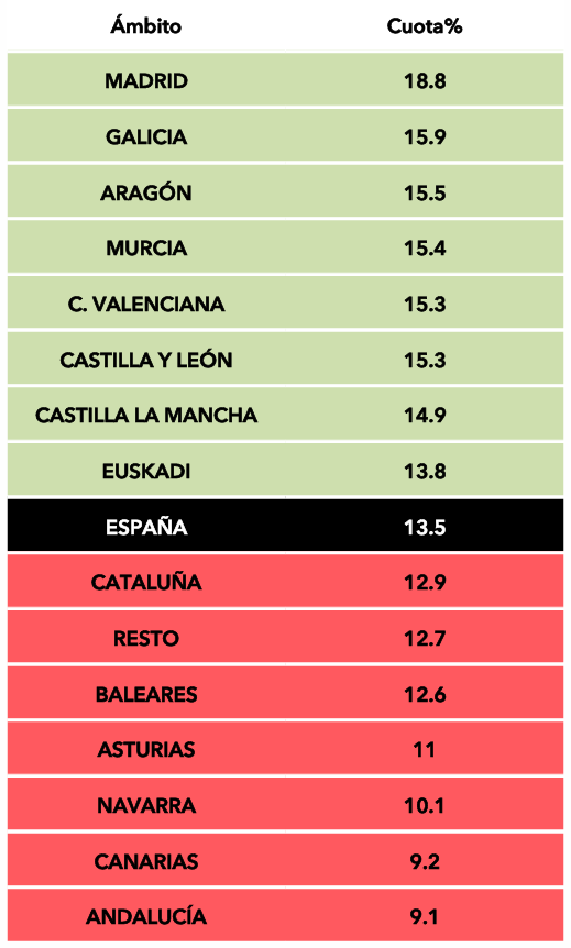 Por debajo de la media nacional se quedaron Cataluña con un 12,9%, Resto con un 12,7% y Baleares con un 12,6%. Mientras que sus peores resultados se dieron en Asturias (11%), Navarra (10,1%), Canarias (9,2%) y Andalucía (9,1%).