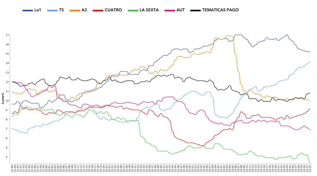 La curva minuto a minuto del grueso de la emisión fue en ascenso a medida que pasó el programa y se aprecia como TVE comienza por debajo del 10% siendo superado por Antena 3 pero a partir de las 22:10 horas cuando entró el director de cine fue aumentando hasta marcar datos por encima del 15% más allá de las 23:00 horas.