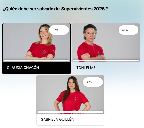Pues bien, a la espera de conocer los resultados oficiales en la tercera gala de 'Supervivientes', en El Televisero te avanzamos el veredicto de nuestros lectores en la encuesta. Y parece que esta semana está todo muy claro pues tanto Toni Elías como Claudia Chacón cuentan con el apoyo para mantenerse en la isla con un 43 y un 37% respectivamente.