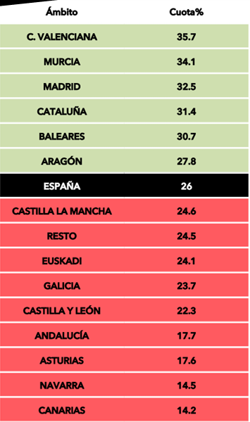 Por debajo de la media nacional se quedaron Castilla La Mancha (24,6%), Resto (24,5%), Galicia (23,7%), Castilla y León (22,3%), Andalucía (17,7%) y Asturias (17,6%). Mientras que los peores datos se dieron en Navarra (14,5%) y Canarias (14,2%).