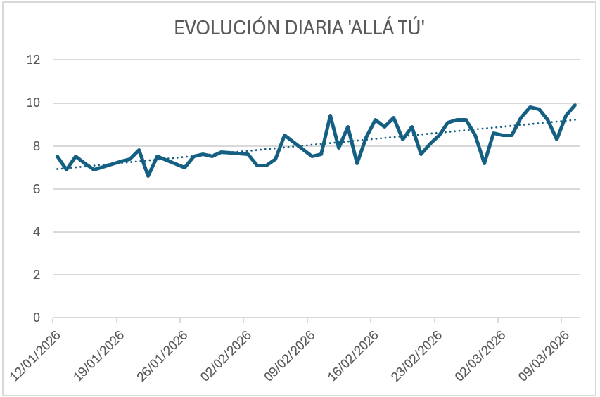 Evolución diaria de audiencias de 'Allá Tú' | Datos: Dos30'