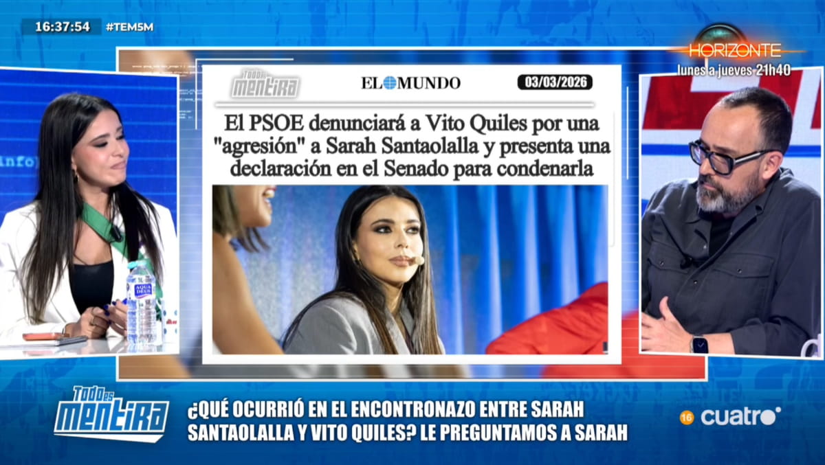 Tras ello, Sarah Santaolalla reconocía que "estoy tocada, estoy fastidiada y creo que además es un tiempo muy difícil porque ha sido un acoso muy reiterado". "¿Qué ha pasado exactamente porque yo he visto vídeos y muchos comentarios en redes y...?", trataba de saber el presentador de 'Todo es mentira' sobre lo sucedido con Vito Quiles después de que muchos hayan puesto en entredicho tal agresión.