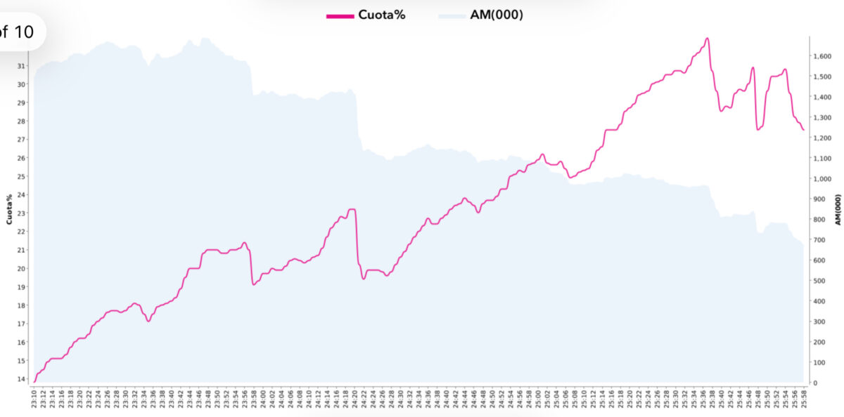 La curva minuto a minuto del grueso de la emisión fue formidable, arrancando en un 14% de share y acabando por encima del 30%. La crecida fue muy pronunciada como refleja la siguiente gráfica:
